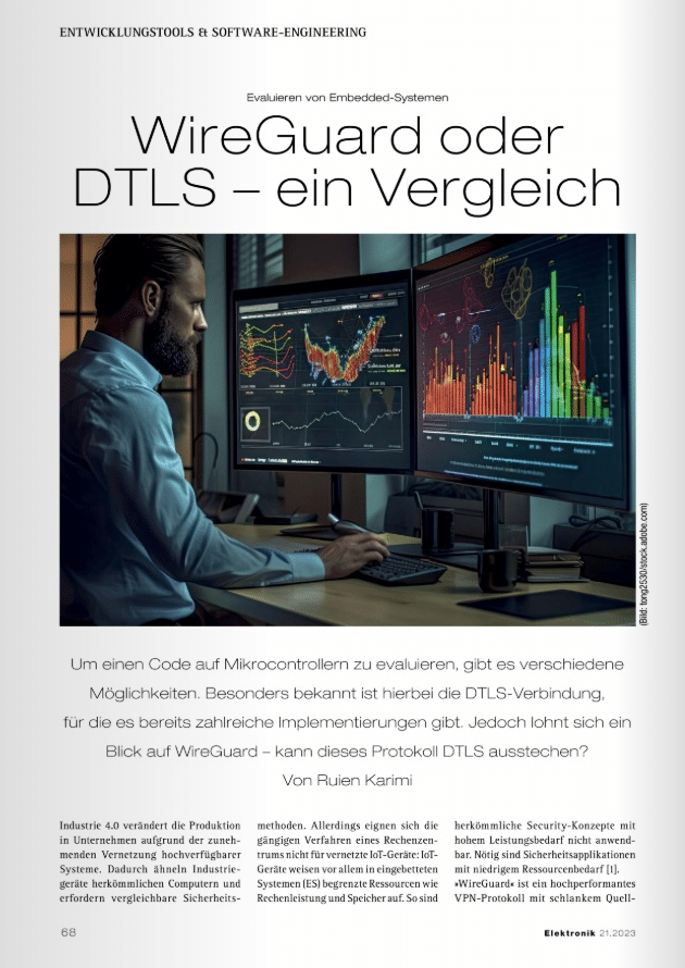 Leseprobe:„Um einen Code auf Mikrocontrollern zu evaluieren, gibt es verschiedene Möglichkeiten. Besonders bekannt ist hierbei die DTLS-Verbindung, für die es bereits zahlreiche Implementierungen gibt. Jedoch lohnt sich ein Blick auf WireGuard – kann dieses Protokoll DTLS ausstechen?“
